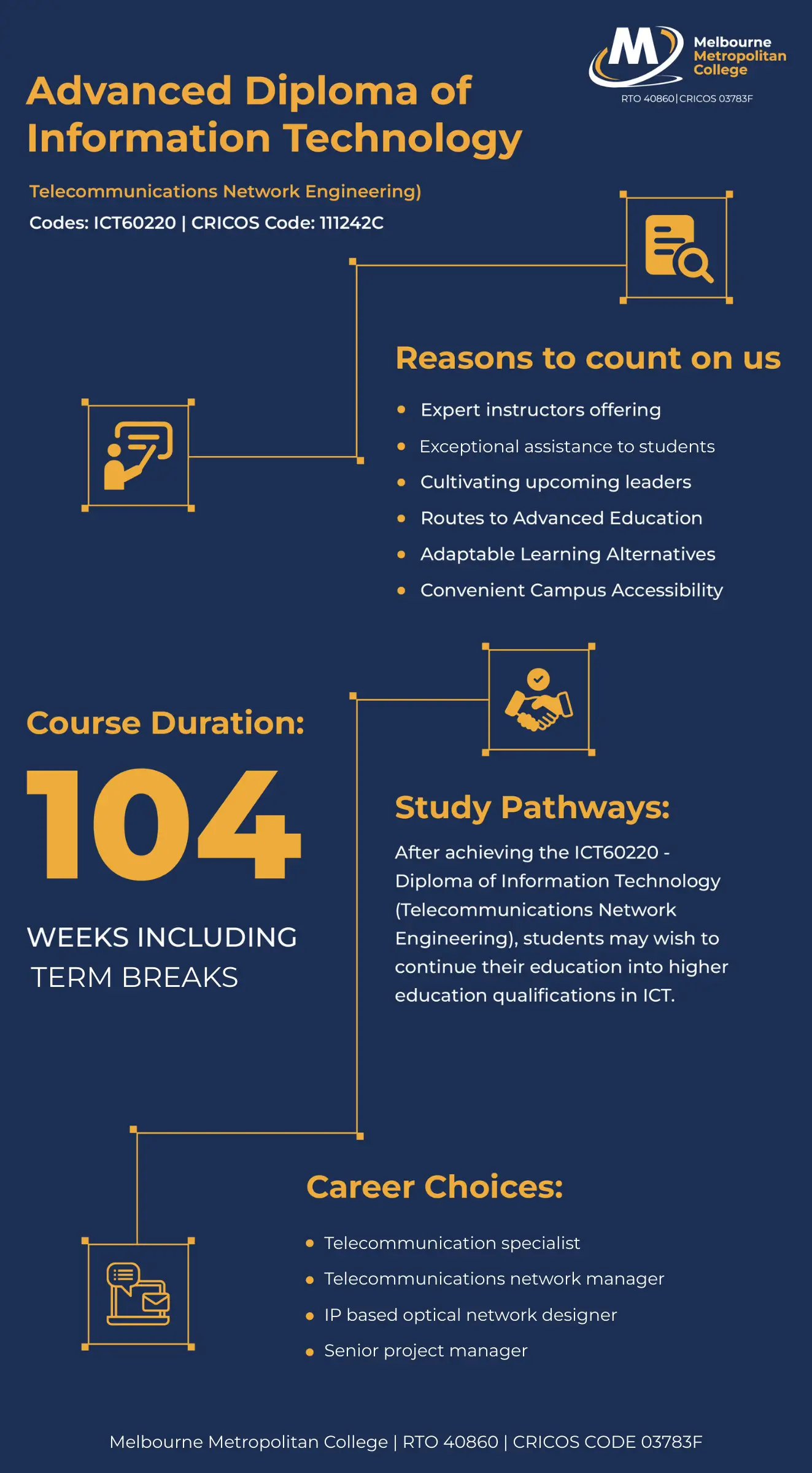 The Advanced Diploma of Information Technology (Telecommunications Network Engineering) provides high-level information and communications technology (ICT), process improvement, and business skills and knowledge to enable an individual to be effective in senior ICT roles within organisations. The qualification builds on a core of management competencies, specialist, and general skills in the telecommunications industry.