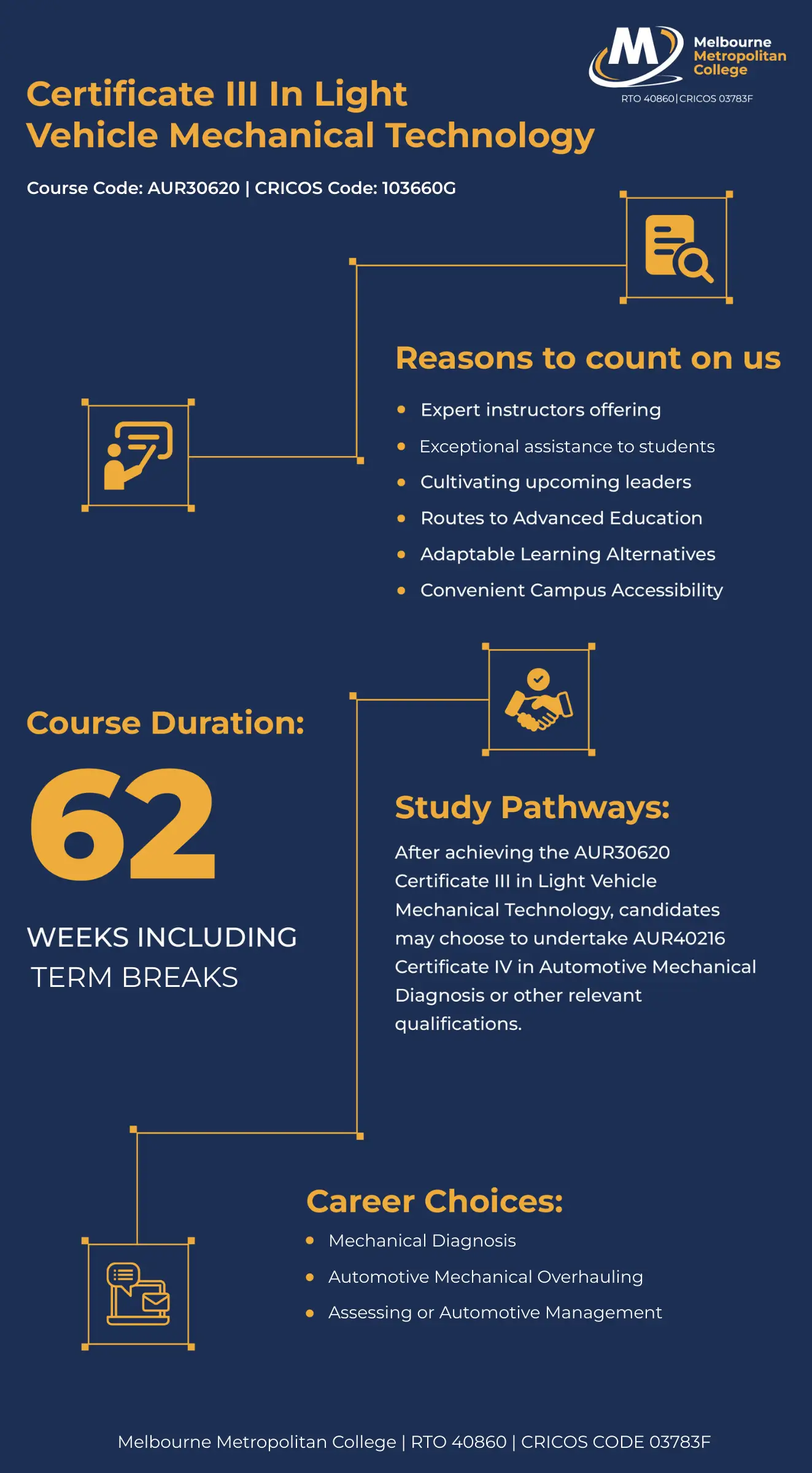 A nationally recognised/accredited Qualification at the Certificate III Level, AUR30620 Certificate III in Light Vehicle Mechanical Technology.
