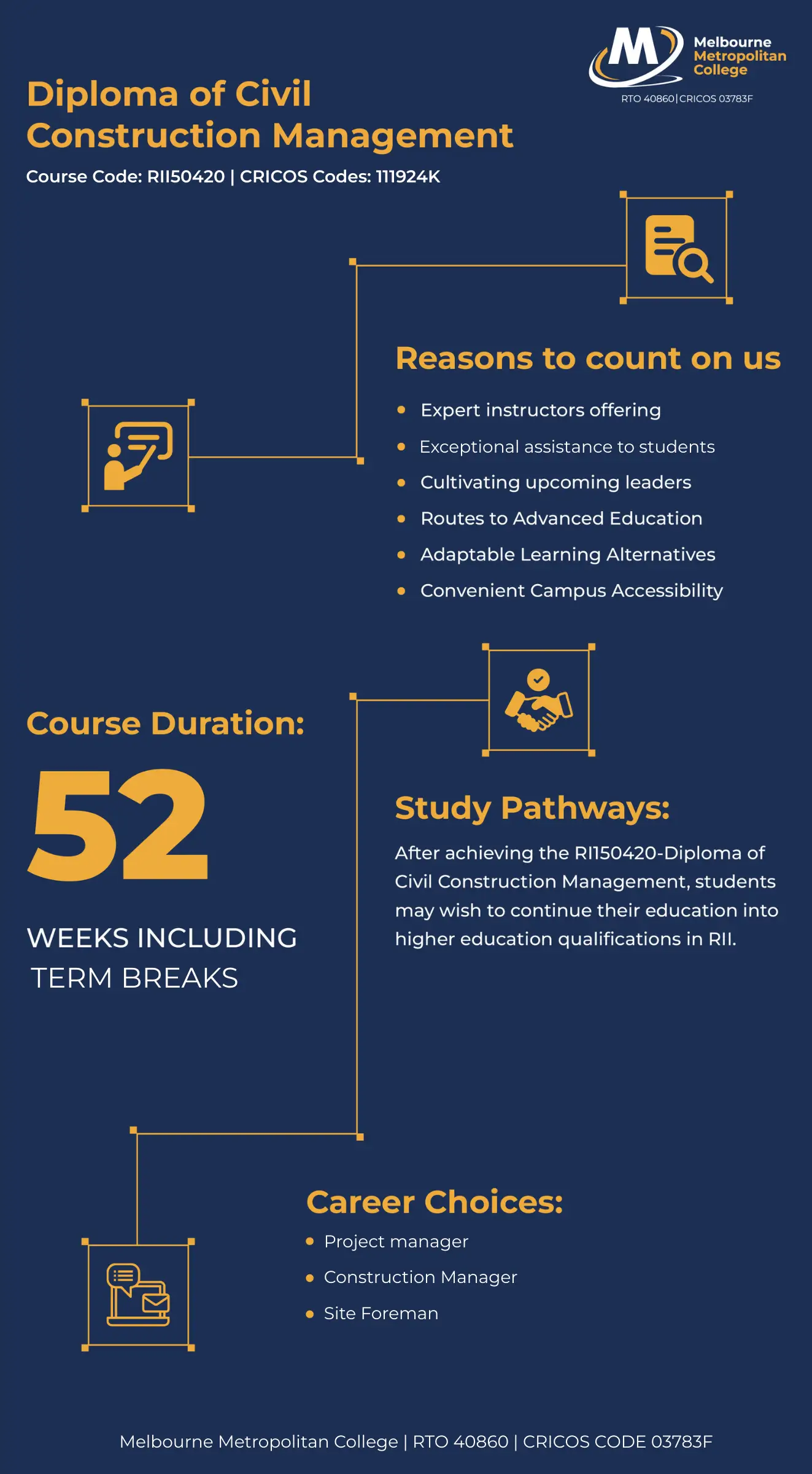 This nationally-recognized qualification on the Diploma of Construction Management prepares you with all the foundational and practical knowledge and a hands-on career in construction management.